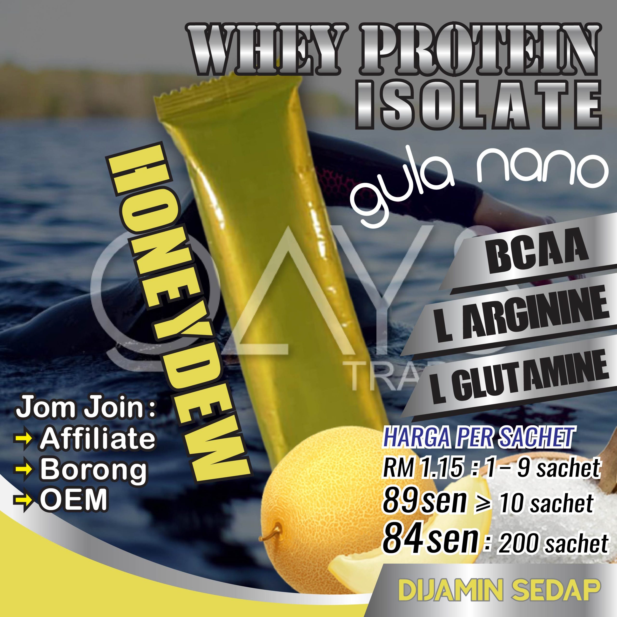 Bahan-Bahan: Protein Isolate, BCAA, L Arginine, L Glutamine, Honeydew & Gula Nano.